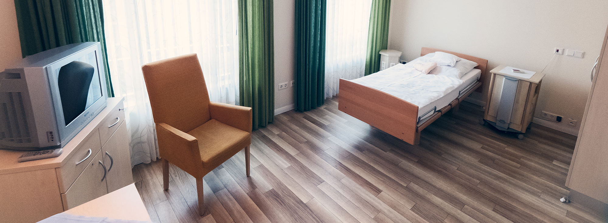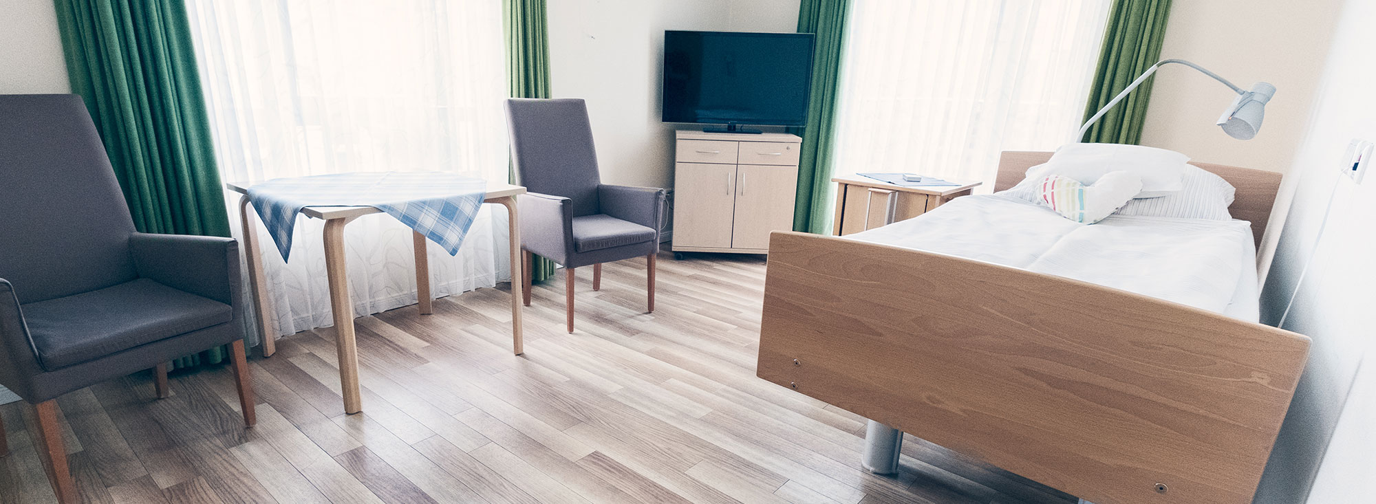 Die Grundausstattung besteht aus einem elektrisch verstellbaren Pflegebett, einem Schrank, einem Tisch und Sitzgelegenheiten. Die Zimmer verfügen über einen W-LAN-Zugang, TV und Telefon mit einer eigenen Rufnummer.